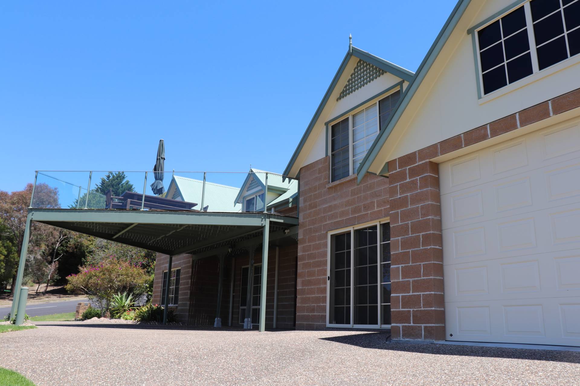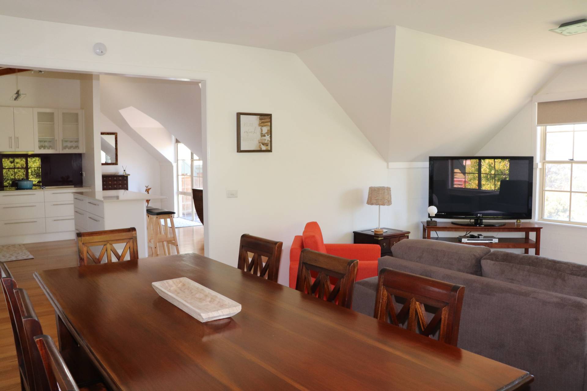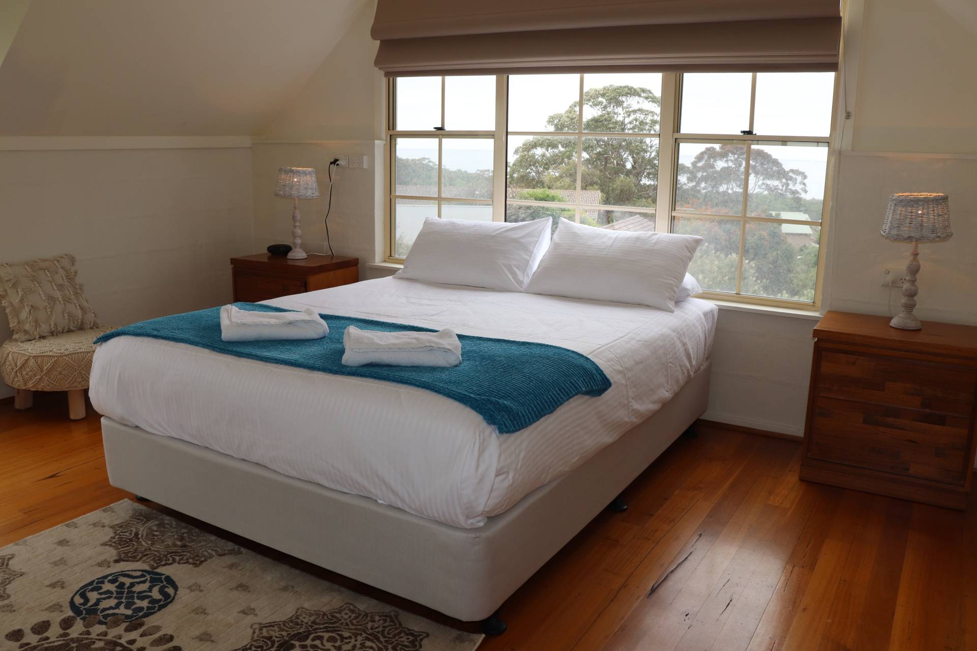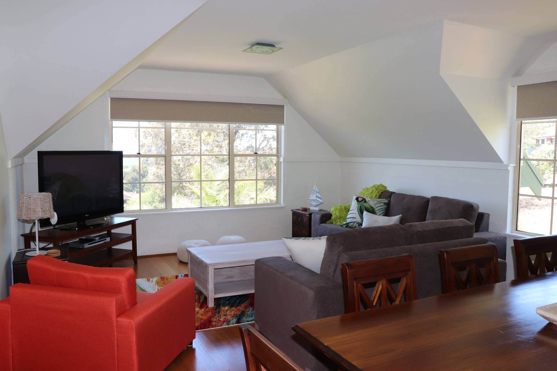 There is a balcony upstairs off the kitchen area with water views with outdoor setting and bbq.