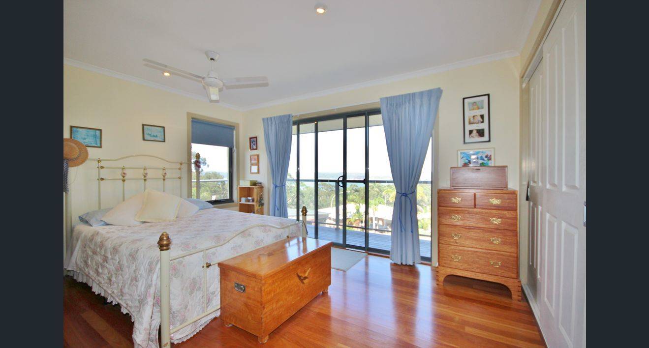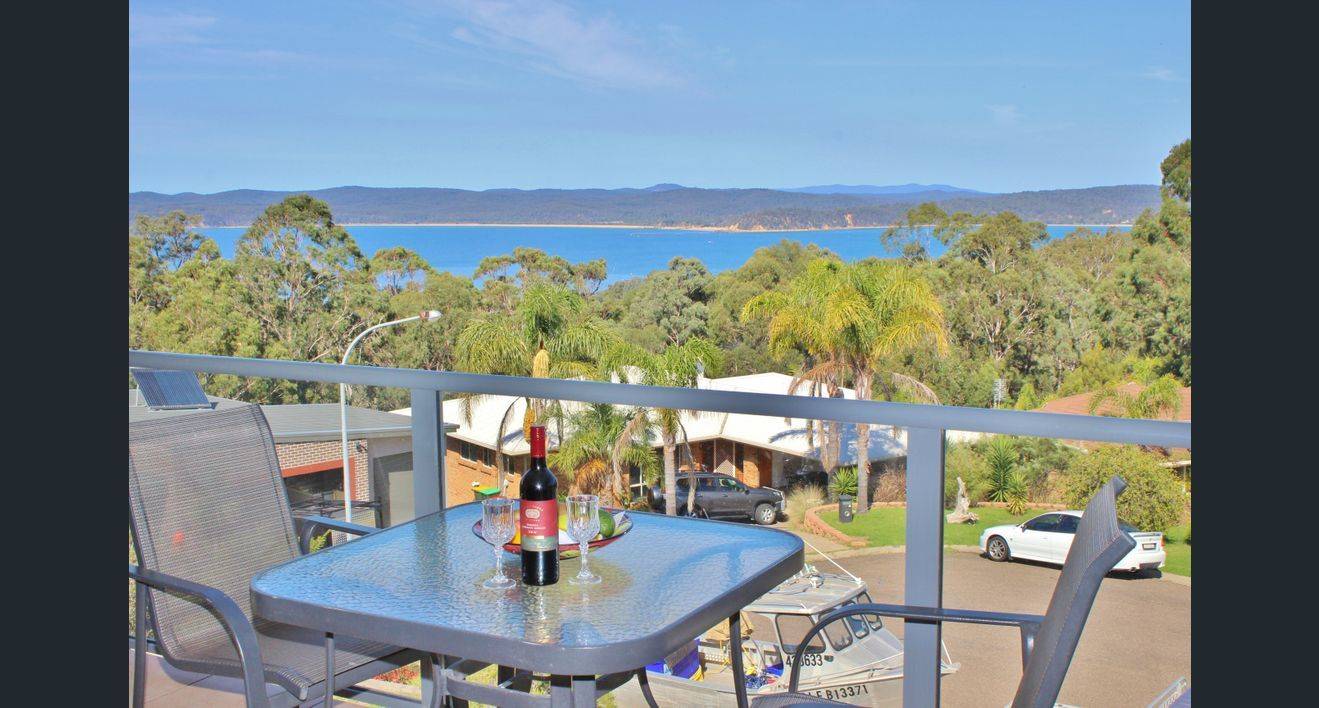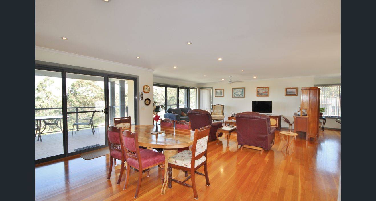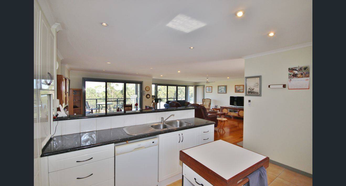 Open plan living/dining/kitchen with covered balcony and water views.