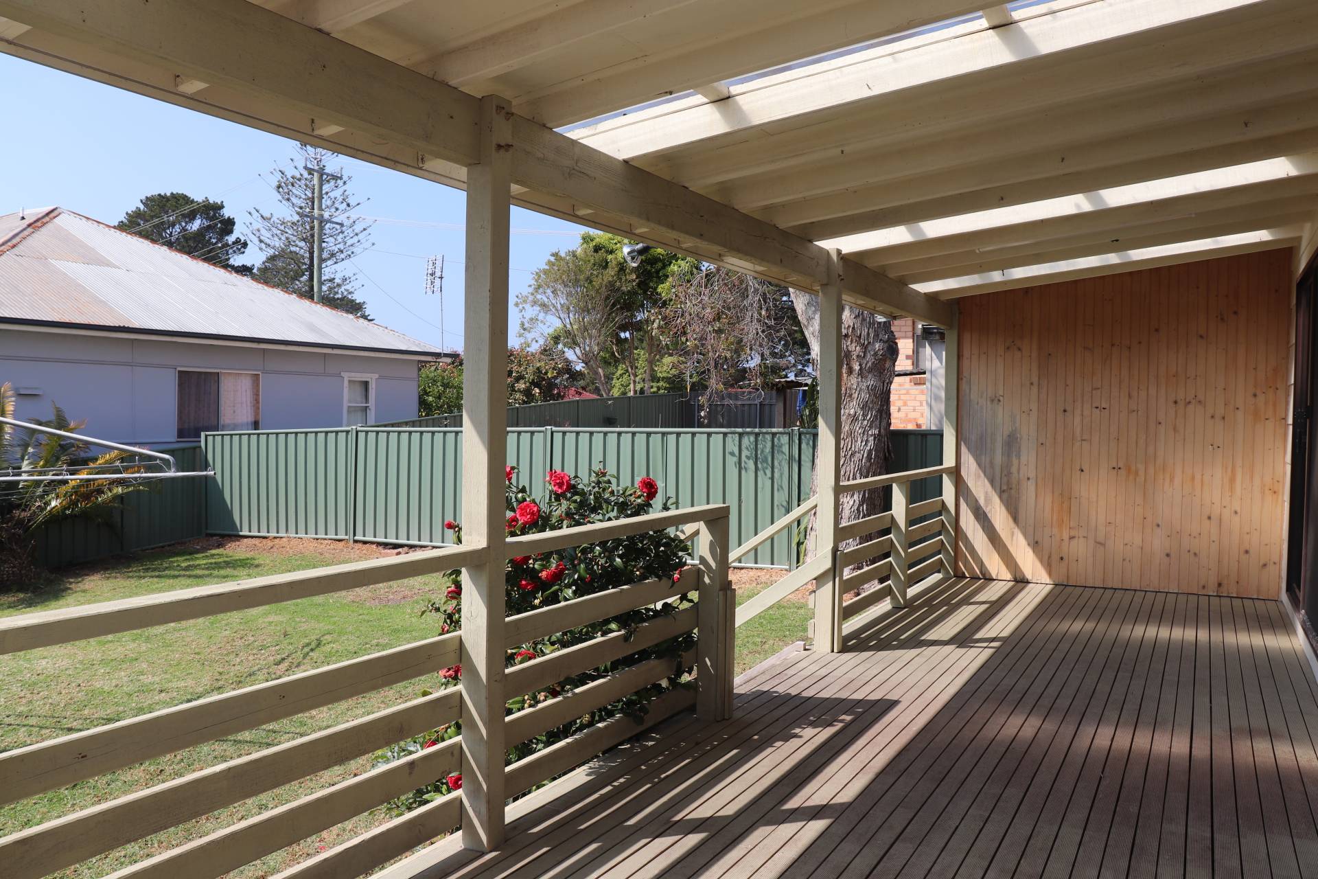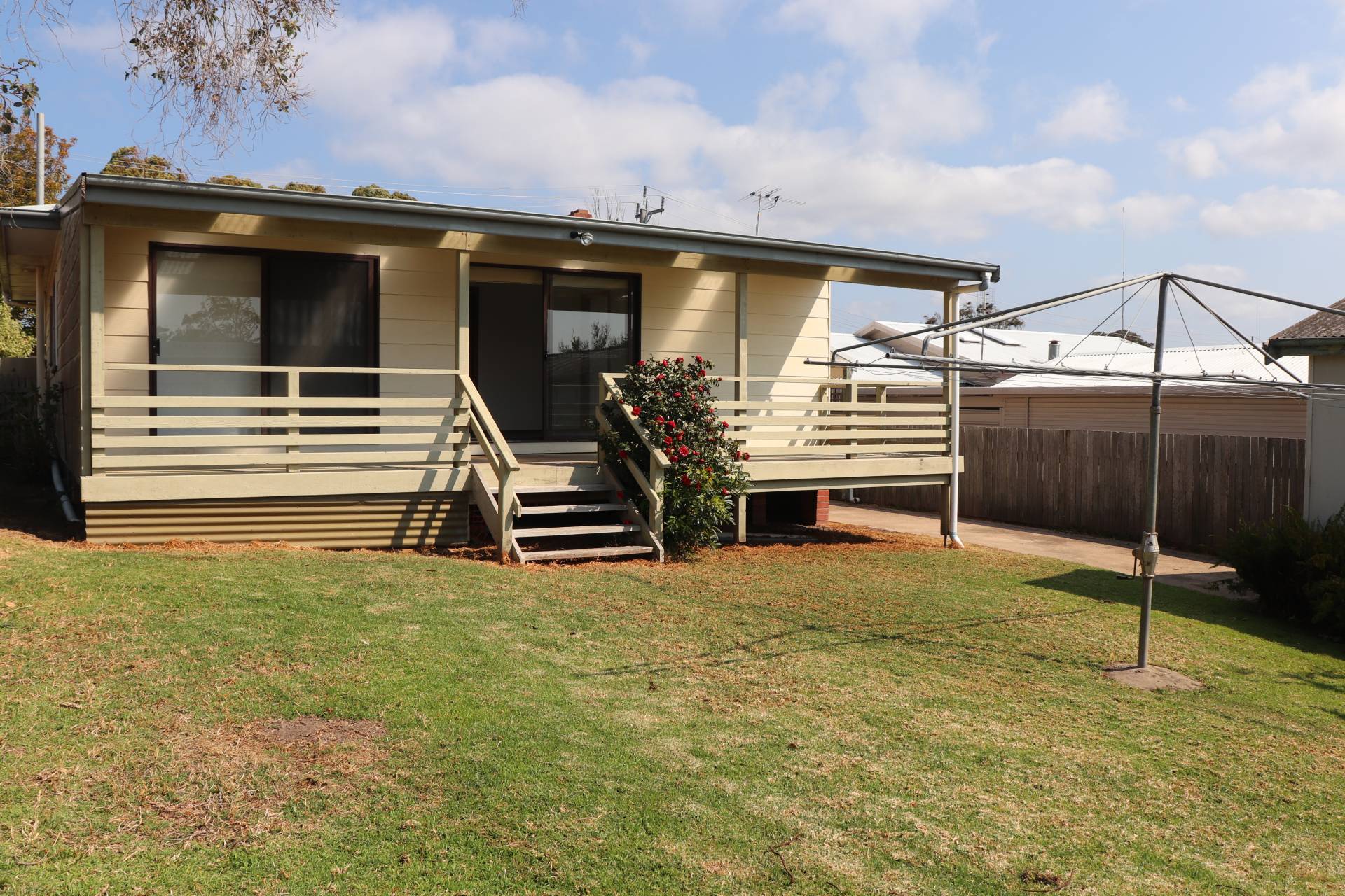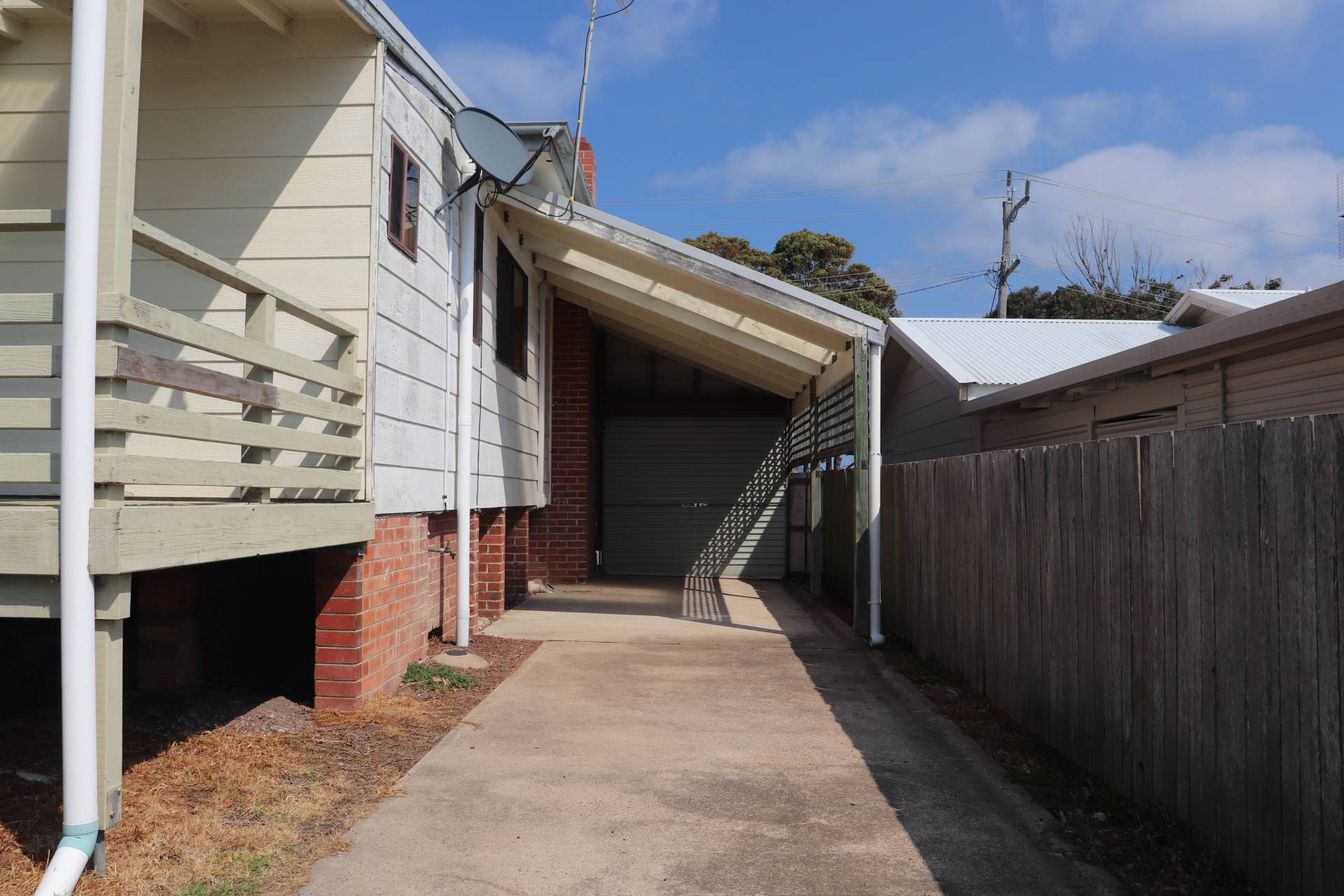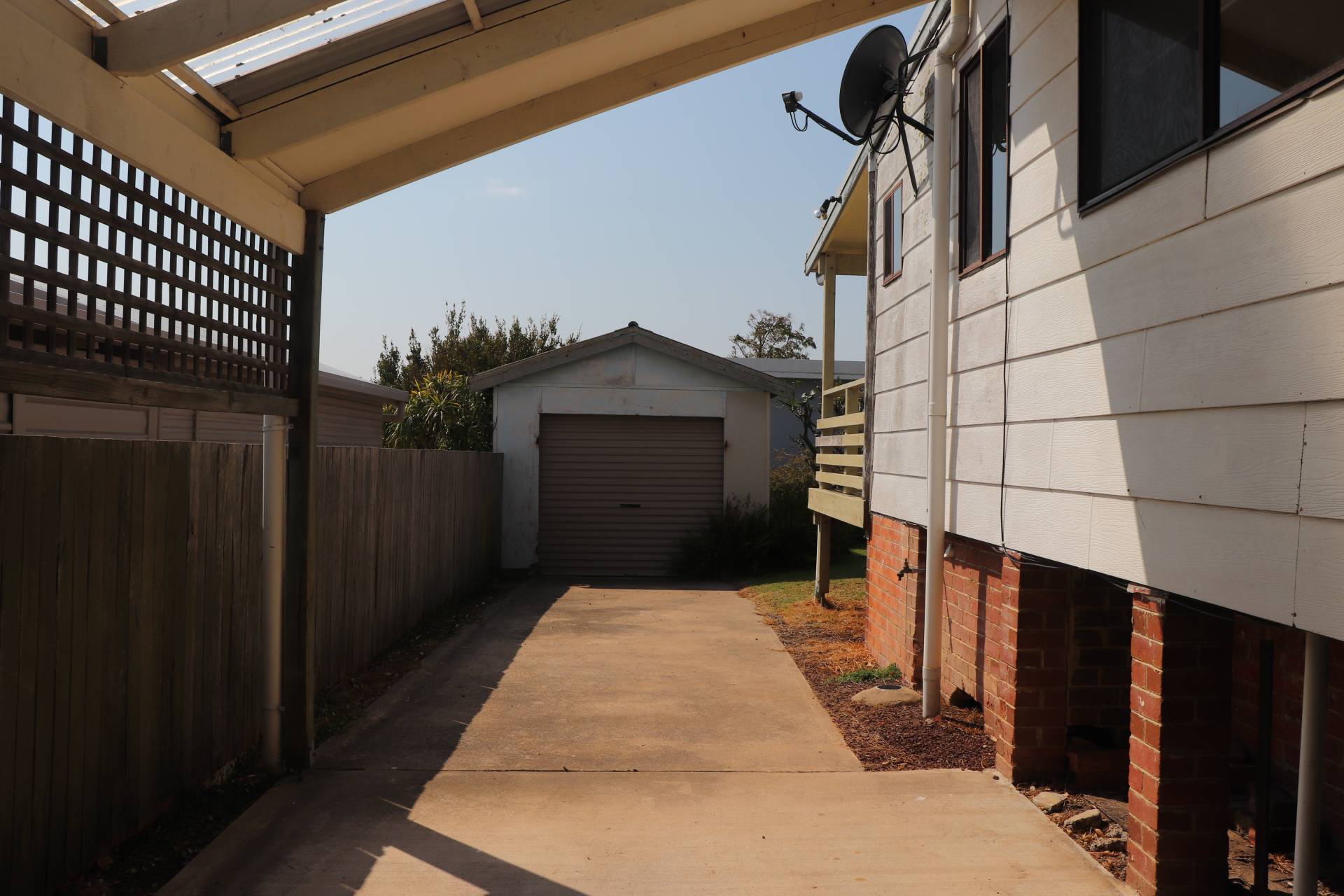 Fully enclosed yard with single garage and secure carport
