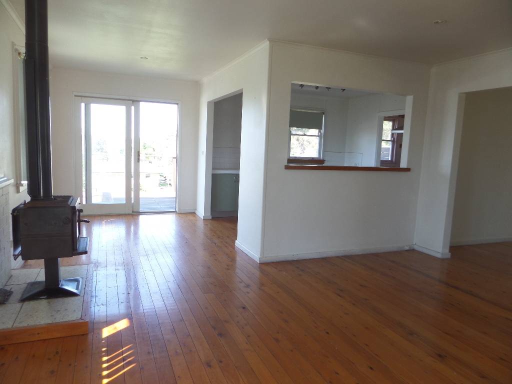 The property has a galley style kitchen with large stainless steel stove and pantry off laundry.  It has an open plan living/dining area with slow combustion fire for heating in winter.